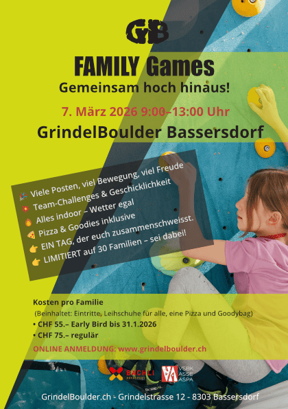 Am 7. März 2026 von 9:00 bis 13:00 Uhr heisst es im GrindelBoulder: Bewegung, Spass und volle Familienpower!